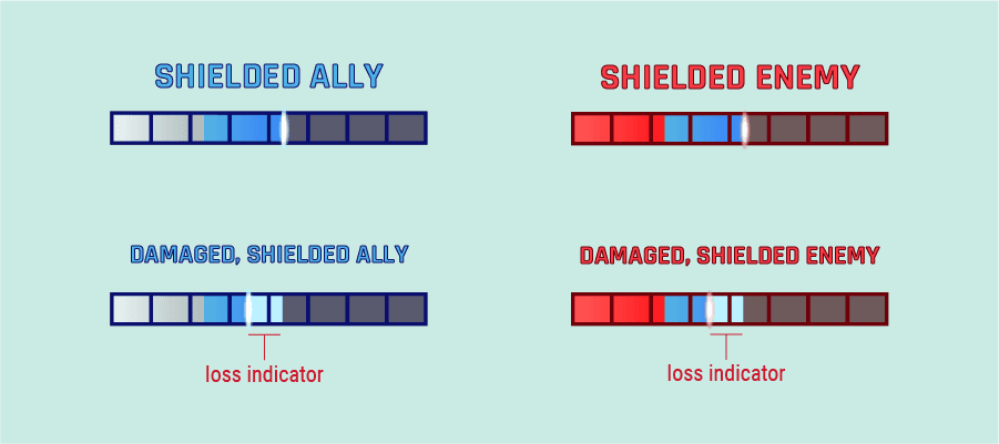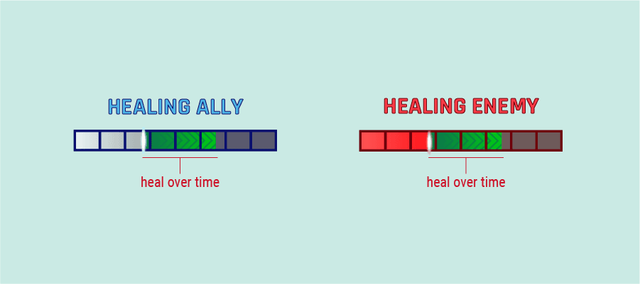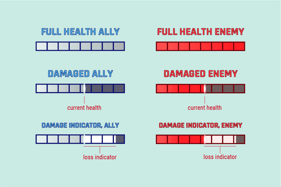 Damage over time (DOT) values were not clearly indicated on healthbars, and players had trouble understanding how much damage they were taking. The new design segments DOT damage being so that a player could better see how dangerous the damage was.